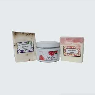 This Greetabl original gift is a 2 oz bohemian rose candle, with an additional two soaps. The fist soap scent is lavender with lavender flower mixed in. The second soap is a pink and white soap scented with white jasmine.