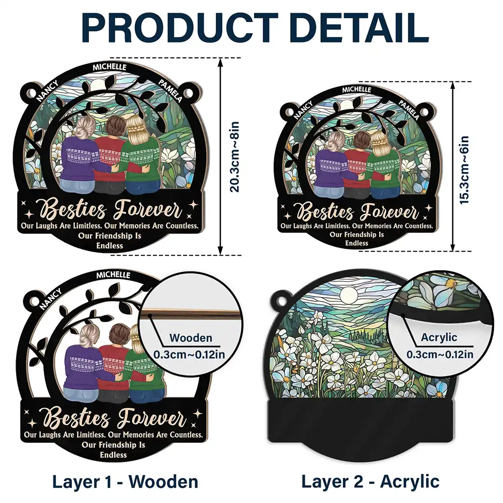 Cherish the bonds of friendship and celebrate special moments with the Limitless Laugh Countless Memories Endless Friendship Besties - Personalized Window Hanging Suncatcher Ornament. Perfect for Sisters, Besties, Siblings, and Women on Thanksgiving, Christmas, birthdays, and anniversaries, this beautiful suncatcher ornament captures the essence of love and enduring connections.